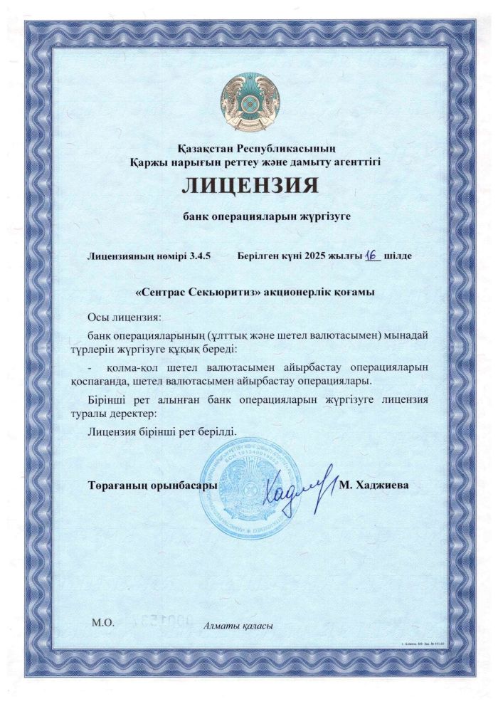 Қазақстан Республикасының қолданыстағы заңнамасына сәйкес, клиенттердің шоттарын номиналды ұстаушы ретінде жүргізу құқығымен бағалы қағаздар нарығында брокерлік-дилерлік қызметті жүзеге асыруға арналған лицензияға (лицензия №0401200886, 2004 жылғы 22 қыркүйекте берілген, мерзімсіз, лицензияны берген орган Қазақстан Республикасының Қаржы нарығын және қаржы ұйымдарын реттеу мен қадағалау агенттігі) ие «Сентрас Секьюритиз» АҚ, банктік операцияларды жүргізу құқығымен банктік операцияларды жүргізуге лицензия алғанын хабарлайды (ұлттық және шетел валютасындағы):
