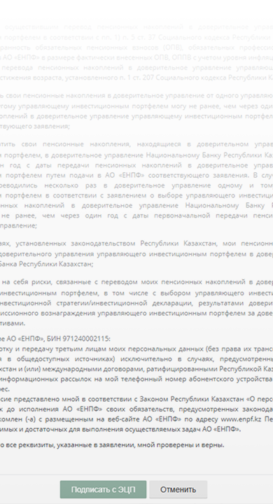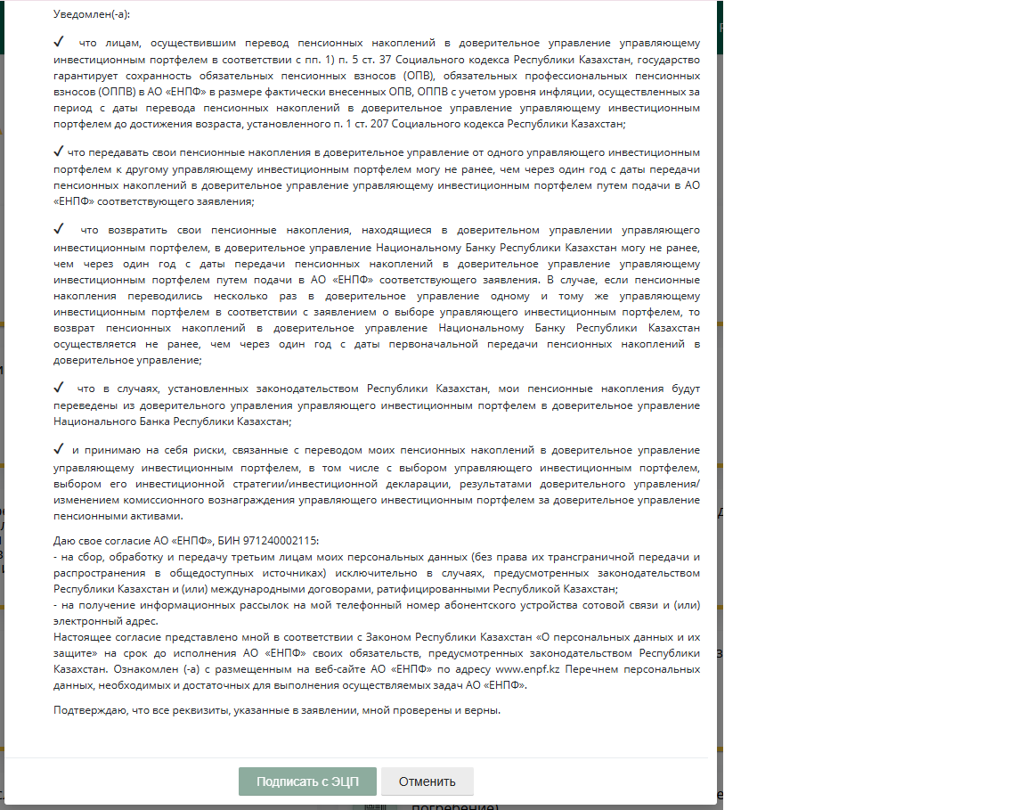 Вы можете отслеживать статус исполнения заявления на Главной странице личного кабинета в подразделе «Мои заявления на выплаты/переводы». ЕНПФ осуществляет передачу пенсионных активов в управление АО «Сентрас Секьюритиз» в течение 30 календарных дней.